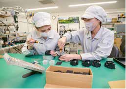 先輩社員(右)から製品の組み立てを教わる社員。ジョブローテーションは、仕事の属人化を抑制するとともに、さまざまな技術を習得したゼネラリストを育てます。