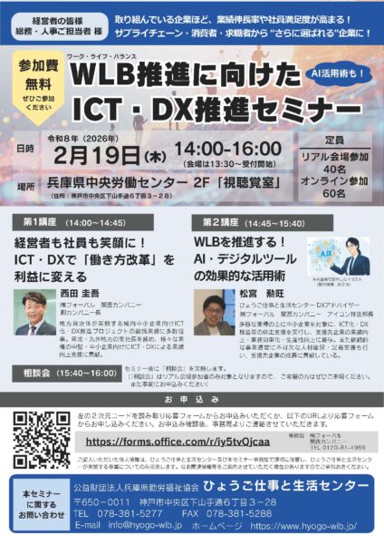 兵庫県内企業の皆様が、社内でICT・DXを推進されることで、業務効率化・生産性向上・コスト削減等を実現され、人材採用・社員の定着率や満足度向上など、WLB(ワーク・ライフ・バランス)を推進するご活動を応援するセミナーです!