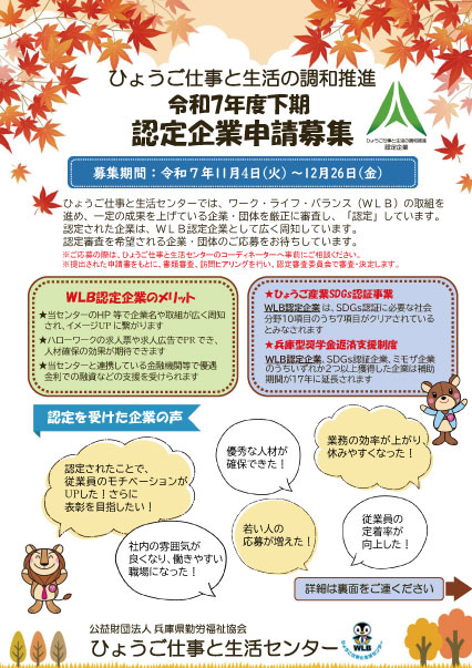 2025年(令和7年)度下期 ひょうご仕事と生活の調和推進認定企業申請募集のお知らせ